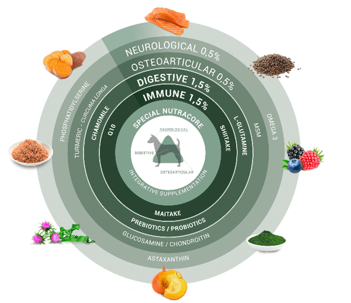 ПРЕДИМСТВА Вкусна храна без зърнени култури за възрастни кучета от малки породи . Прясна сьомга като основен източник на протеини и омега 3 (EPA и DHA). Включва други съставки като спирулина , сладки картофи и леща . Nutracore осигурява специална подкрепа за храносмилателната и имунната система. Супер съставки като майтаке, шийтаке и Q10 помагат за поддържане на здрава имунна система. L-глутамин , лайка , пробиотици и пребиотици укрепват храносмилателната система. Куркумата , фосфатидилсеринът и МСМ имат ефект върху остеоартикуларната и неврологичната система.
