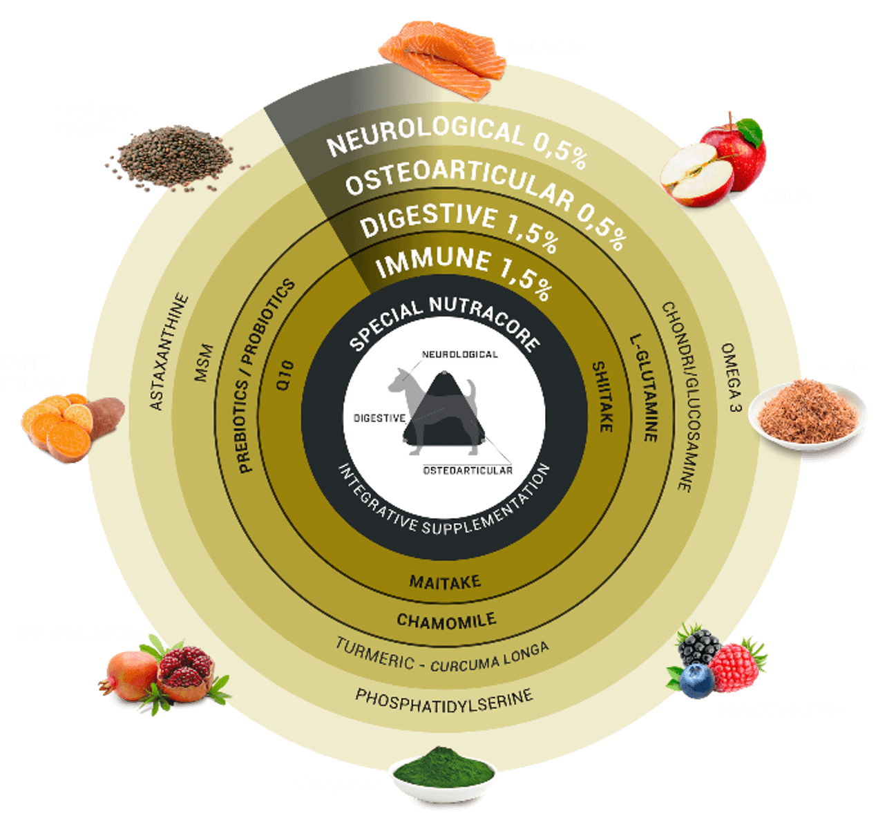 ПРЕДИМСТВА Вкусна храна без зърнени култури за възрастни кучета. Прясна сьомга като основен източник на протеини и омега 3 (EPA и DHA). Включва други съставки като спирулина , ябълка и леща . Нутракор осигурява специална подкрепа за храносмилателната и имунната система . Супер съставки като майтаке, шийтаке и Q10 помагат за поддържане на здрава имунна система. L-глутамин , лайка , пробиотици и пребиотици поддържат храносмилателната система. МСМ , куркума , фосфатидилсерин и омега 3 действат върху костно-ставната и неврологичната система.