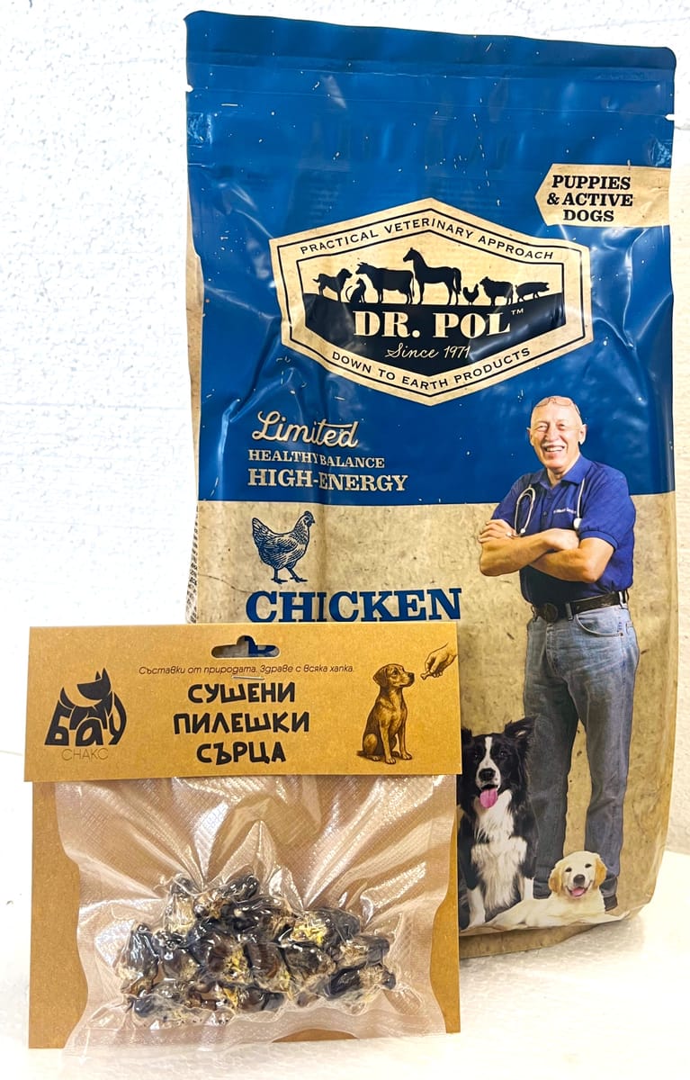 При поръчка на Dr. Pol Chicken Puppy and Active 30% протеин – 2кг. Подарък лакомства (сушени пилешки сърца БАУ)