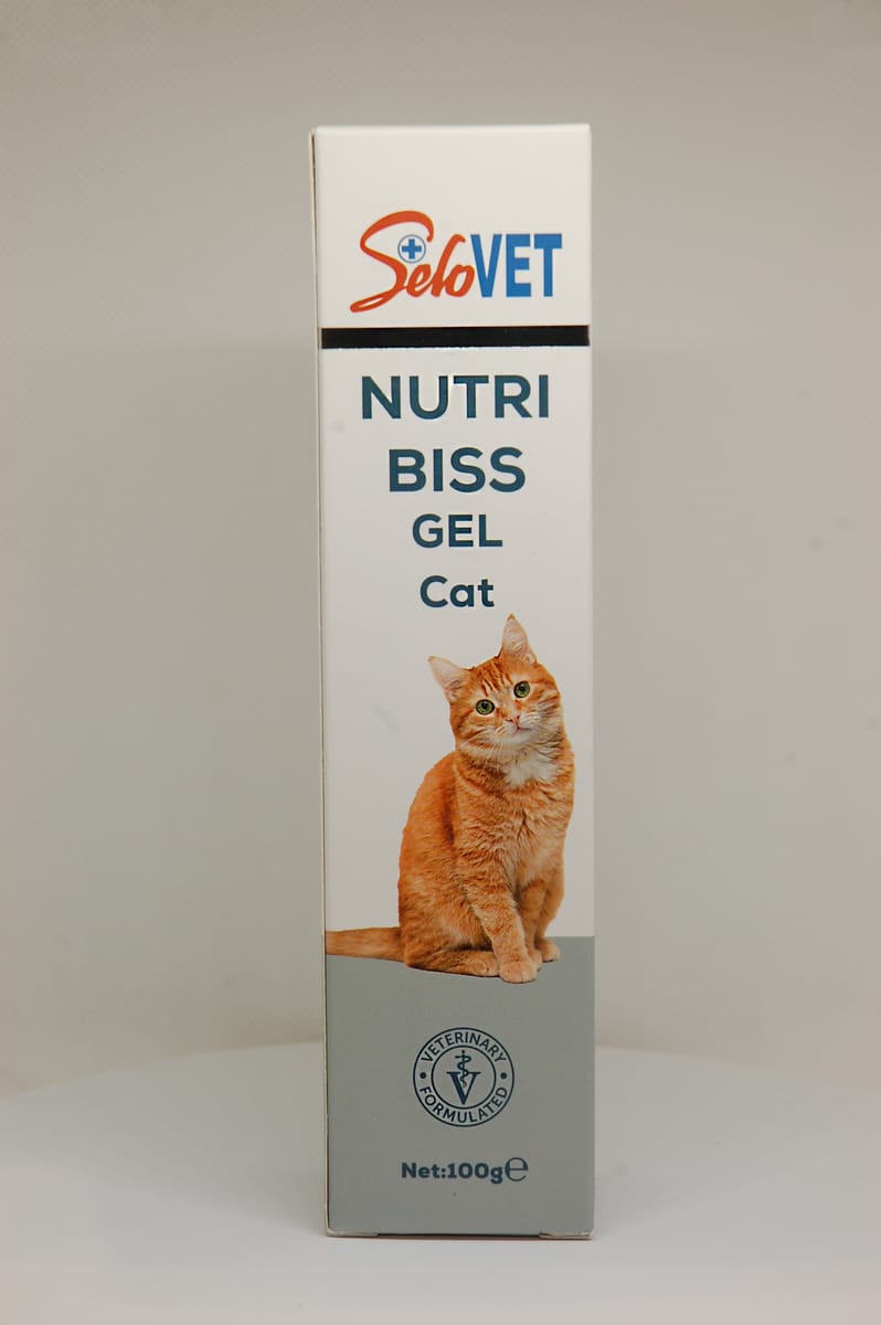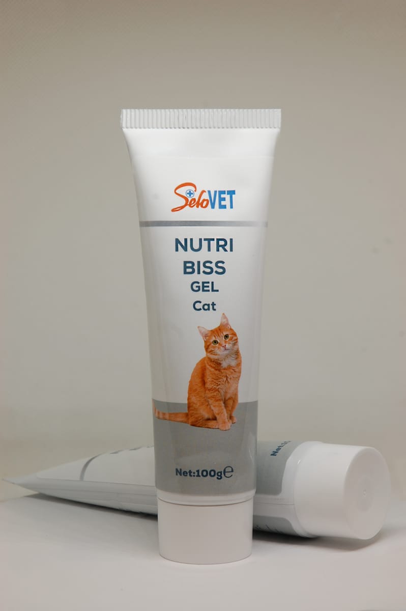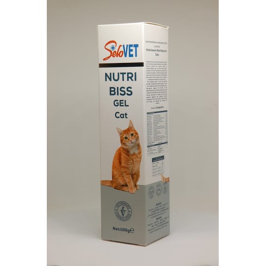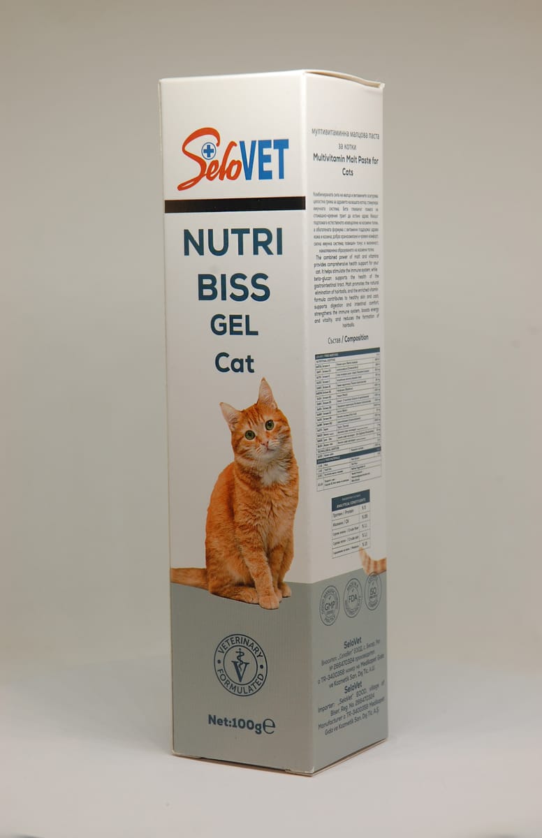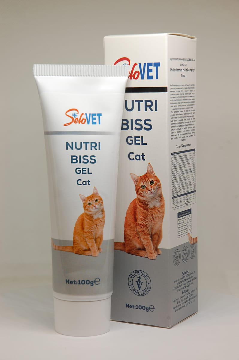 Малцова паста за котки, обогатена с витамини - Нутри Бисс Гел - 100 гр. Комбинираната силата на малца и витамините осигурява цялостна грижа за здравето на вашата котка, стимулира имунната система. Бета глюканът помага на стомашно-чревния тракт да остане здрав. Малцът помага естественото разграждане и изхвърляне на космените топки, а обогатената формула с витамини поддържа здрава кожата, козината, доброто храносмилане, чревен комфорт, силна имунна система, повишен тонус и жизненост. Състав: Витамин А - 1500 IU; Витамин Д3 - 1150 IU; Витамин Е - 200 мг; Витамин С - 100 мг; Витамин В1 - 150 мг; Витамин В2 - 1000 мг; Витамин В3 - 1000 мг; Витамин В5 - 1000 мг; Витамин В6 - 1000 мг; Витамин В7 (биотин) - 400 000 mcg; Витамин В9 (фолиева киселина) - 20 мг; Витамин В12 - 500 mcg; Таурин - 2000 мг; Манган - 4 мг; Цинк - 50 мг; Желязо - 70 мг; Калиев сорбат - 1000 мг; Други - малц, бирена мая, растително масло и зехтин.